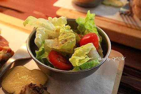 本來一直滿心的期待,因為看網評說超大份,不過...看到時和友人有點小失望,因為沒有很大份啊!一旁附的薯塊大概每天都不同吧!有時是炸薯條,有時是薯泥,今天的是薯塊...先來說一下這薯塊好了,個人覺得這薯塊做的很失敗,香料放太多了,放入口中,盡是迷迭香及俄勒岡葉的味道,完全失了馬鈴薯該有的香氣了!