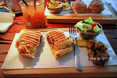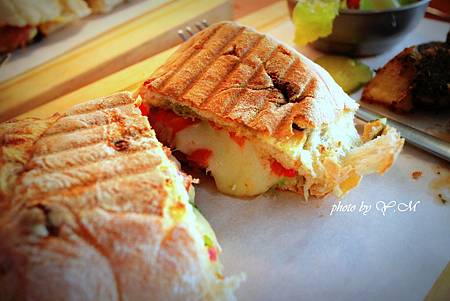 不過說真的,我怎麼覺得店家的里肌和香腸吃起來味道是一樣的?!友人覺得我的香腸薯泥起士帕尼尼比較優~~(我自己也這麼覺得)這青醬味道不重,感覺好像都是里肌?以及起士的味道較重...