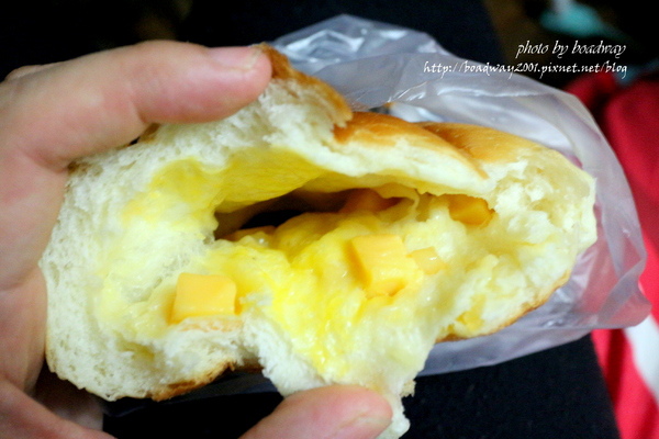 起士哈司裡面包了不少的起司,口感上比吐司略硬一些些,但大致上還是偏軟的,麵包體本身微微甜,加上鹹鹹的起士,我覺得非常搭~~