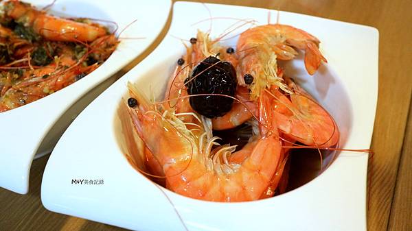 冷蝦佐檸香甘梅羅望果醬:這道也是少見,還加了話梅和羅望果醬及梅子粉,很有創意啊!不知味道如何!