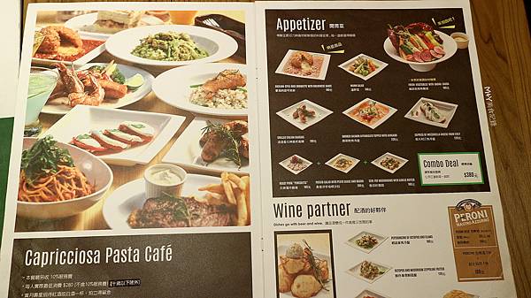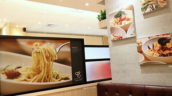 牆上則掛著許多食物的照片,看看那義大利麵好吸引人啊!話說boadway一直很喜歡卡布里喬莎的義大利麵啊!