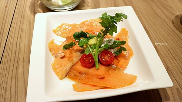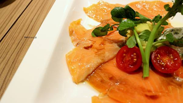 一盤酪梨鮭魚冷盤有四大片的煙燻鮭魚,每一片都十分飽口美味,蕭老大竟然趁我不注意,就快速的吃下三大片,就可以知道這道冷盤有多合他的胃口了!