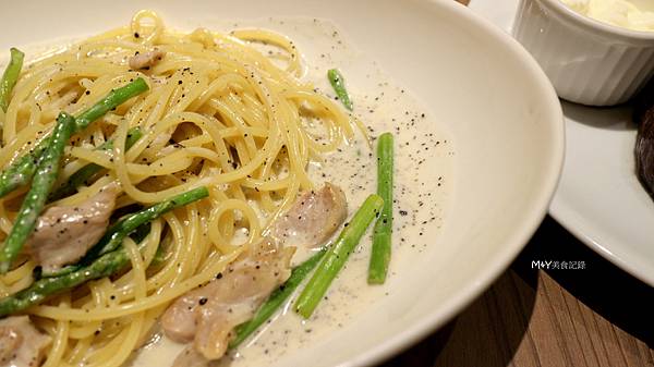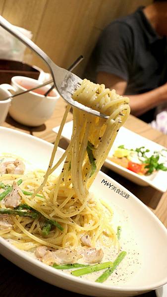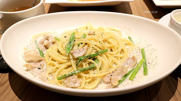 又雖然醬汁沒有收得很乾,但每口麵條都被醬汁均勻的包裹著,吃進口中,除了奶香外,還透著淡淡的松露香氣,再搭上超嫩口的雞肉及口感細緻的蘆荀,我只能說好好吃啊!