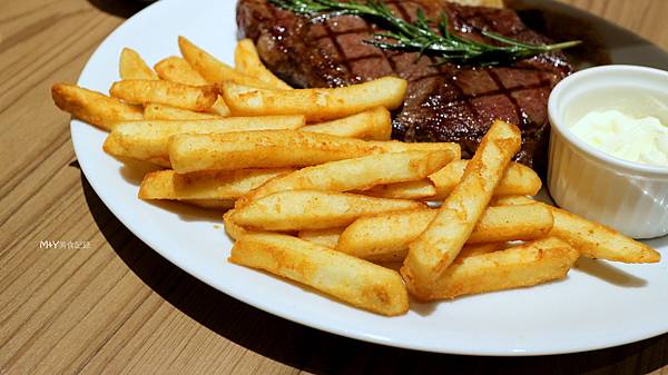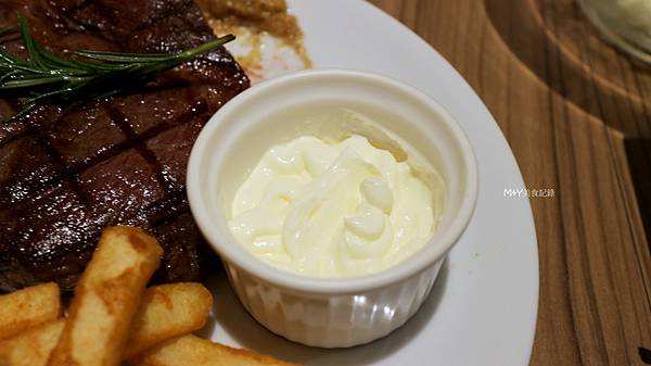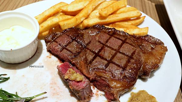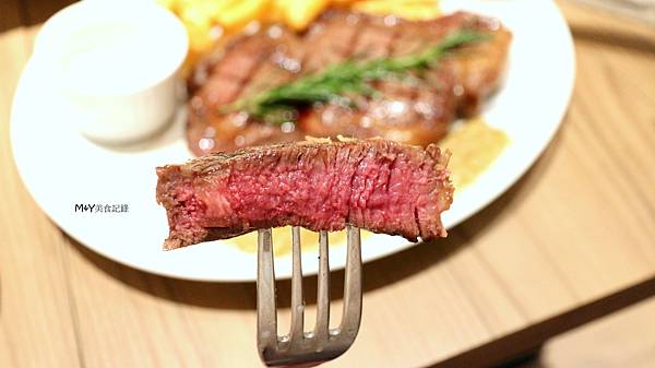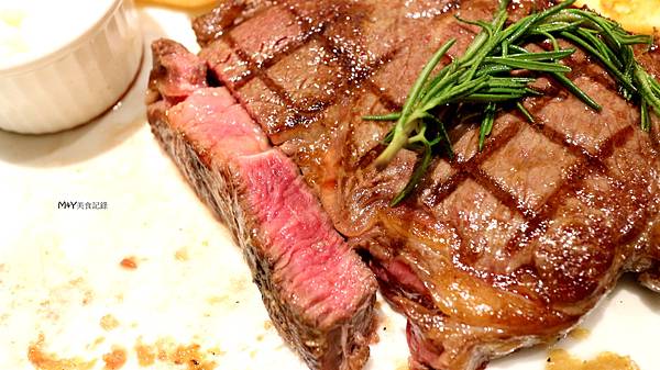 炙烤肋眼牛排一送上桌時,我只能說這牛排烤得真漂亮啊!上面再放枝迷迭香,讓牛排有著淡淡的迷迭香味,卻又不會太過~我喜歡這種調味方法。