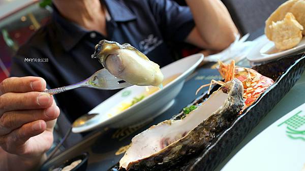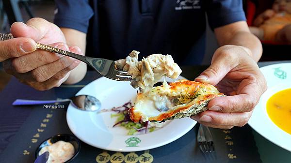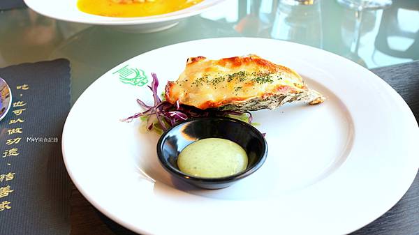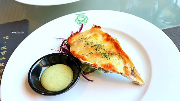 鑲鑽焗生蠔(588義式套餐):生蠔很新鮮,覺得用焗烤很是可惜,佐上青色沙拉醬,香草調製的醬汁一樣味道不明顯,都是沙拉醬居多。