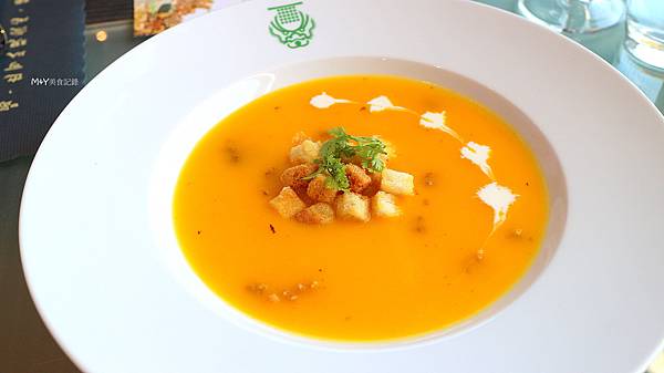 南瓜濃湯:很濃厚的南瓜味兒~感覺有淡淡的堅果香氣,但服務人員說沒有XD
