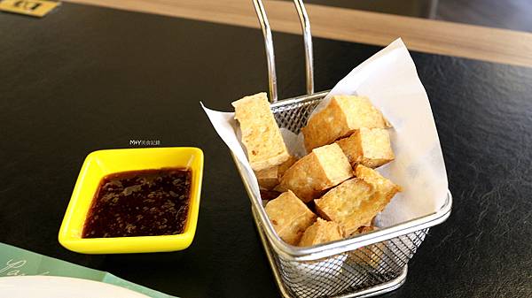 沾上特調的蒜蓉醬汁,帶點微甜滋味,和炸豆腐很搭,好吃!