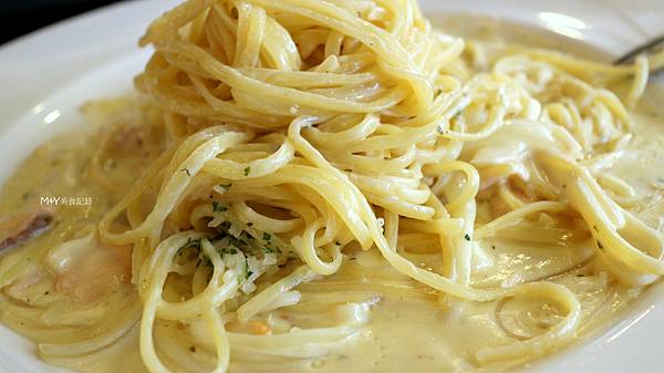 麵條的選用上很特別,和一般的義大利麵不同,自是有點微寬版的,又偏微扁的,因此這麵條又可吸附更多的醬汁。